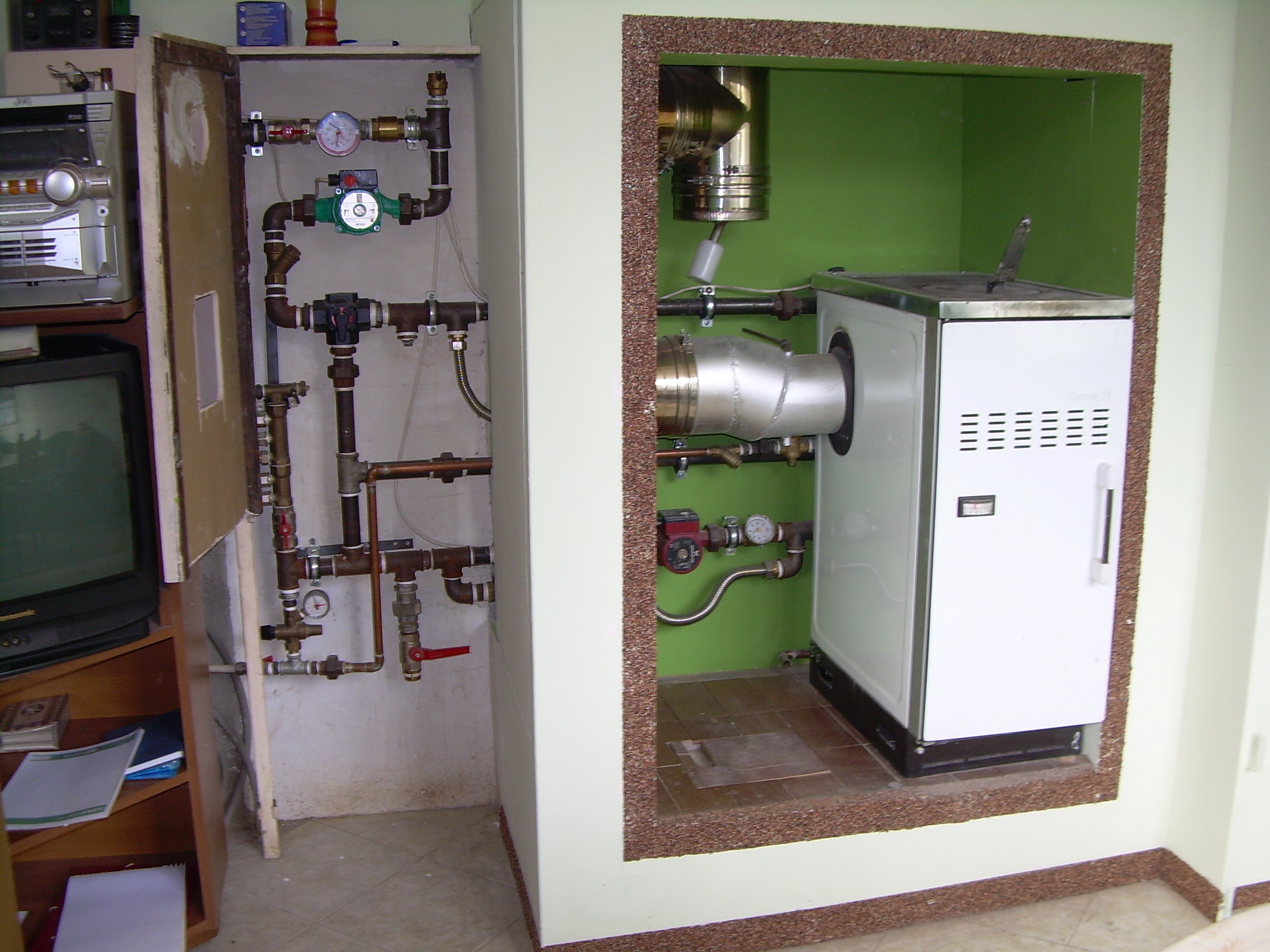 Изкарах няколко години така,но разхода беше доста голям,а и камината често прегряваше,имах проблем с комина и т.н.Махнах я и си купих сръбско котле Централ23 .Сложих го на мястото на камината.С помощта на Антон,Филматипло и др.,на които сърдечно благодаря,преправих инсталацията до този вид по долу.