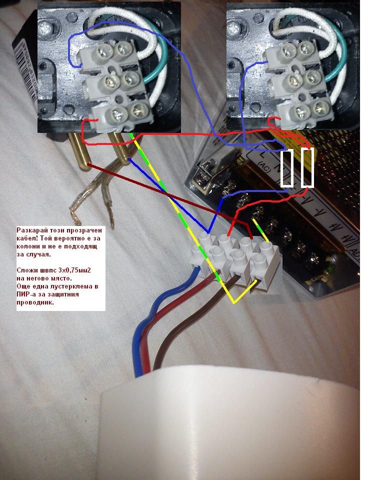 Другият край закарваш до ПИР датчика и с друго парче от същия кабел отиваш към захранването. Всички жълто-зелени проводници свързваш към защитните клеми на датчика и на захранването. ПИР го захранваш с фаза и нула по кафявия и синия проводници от щепсела.