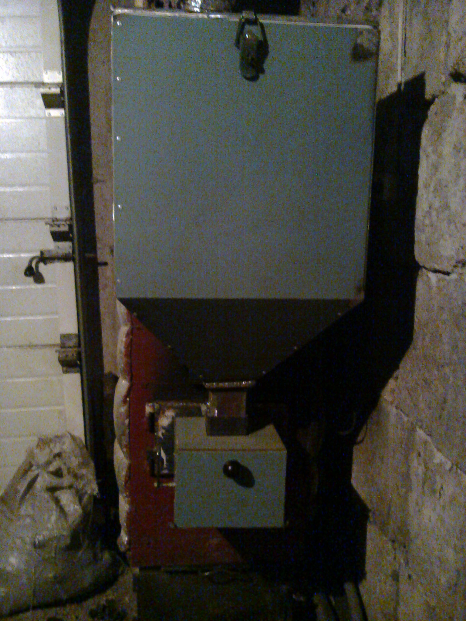Няма шнекове(нито хоризонтални нито вертикални) няма винтелатори няма кабели няма програматори тем подобни затруднения.Има няколко броя решетки с различни отвори.Чрез тях се регулира мощноста.Едно от основните условия за добра работа е уплътнен котел и хубава тяга на комина.Това е философията всичко просто е надежно.Дефакто няма какво да се развали.Няма температурни амплитуди като при въглищата.Работи равномерно в зависимост от това с коя решетка е.В момента е това температурата и повече няма да стане докато не сменя решетката.