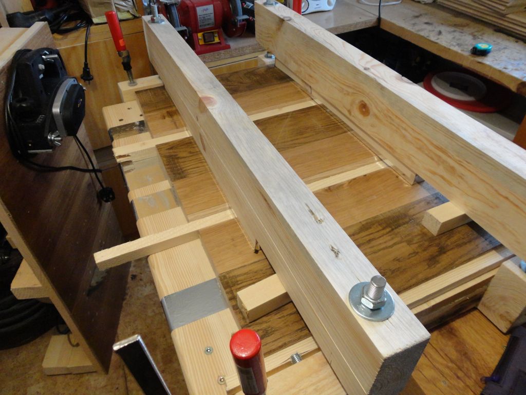 След обед поработих още малко.Нарязах по размер на герунга заготовките, със съответния допуск на хоризонталните парчета.При мен допуска, т.е. увеличението на размера е 22,5 мм.Вече са готови за фрезоване късите страни с контрапрофилния фрезер.Ето как ще изглежда вратата, вече доби някакъв вид.Парчетата само са подредени.Това е идеята.В празните места ще има табли.