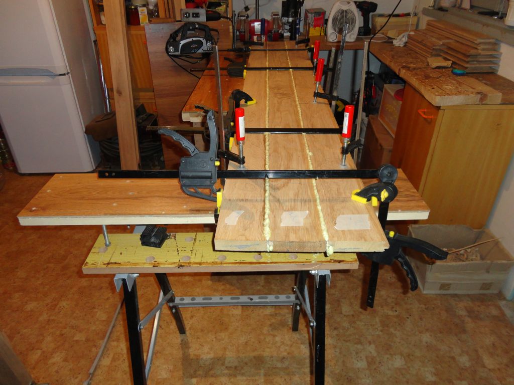 , реших касата да е плътен дъб, широка 30 см, колкото е дебелината на стената, където ще се монтира вратата.Днес напаснах паркетините на двете надлъжни дъски на касата и залепих едната страна.Сега съхне.Утре ще залепя другата.