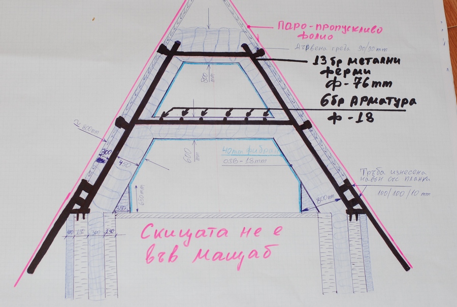 Г-н Цилков на тази скица съм показал точно положението на металната конструкция във ватата. Цялата конструкция е грундирана 3 пъти и боядисана още 3 пъти - 6 слоя боя. Петите са обилно намазани с консервираща смазка. Както се вижда цялата конструкция е в пространството на ватата. Сано 8 планки 100х100х10 излизат извън ватата, но това е почти нищожно, за да говорим за термо мост. Тръбите са запушени, за да няма въздушна конвекция. Ако може коментирайте как ще се движи точката на конденз в следните ситуации: