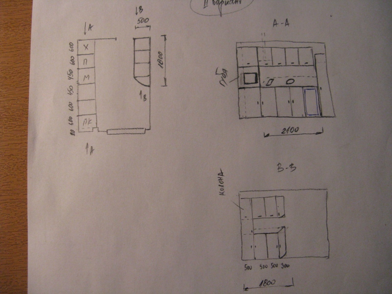 4. С цел осигуряване на повече пространство за складиране на съдове като опция съм направил допълнение на кухнята на срещуположната страна с дължина 1,5-1,8м. Особеното е, че долните шкафчета и плота трябва да са най-много на 50 см.