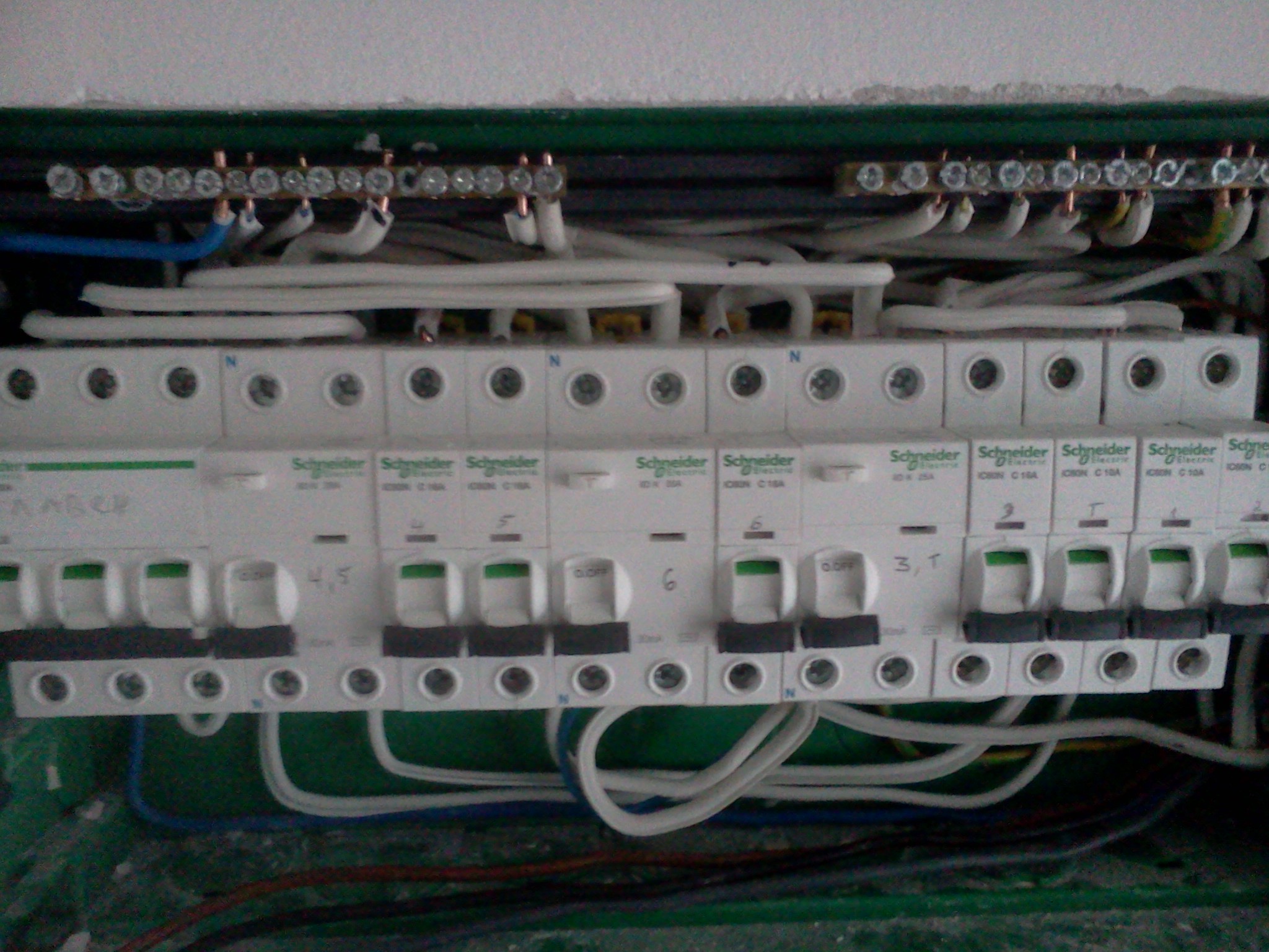 Трите усукани проводника са на клема N на третата ДТЗ - 4 кв.мм токов кръг, 2.5кв.мм единичен контакт от същия токов кръг ( под ел.таблото е и затова е с отделен кабел) и 1.5 кв.мм към тавана ( контакт за нещо и 1 лампа, всичко това с 10А предпазител).