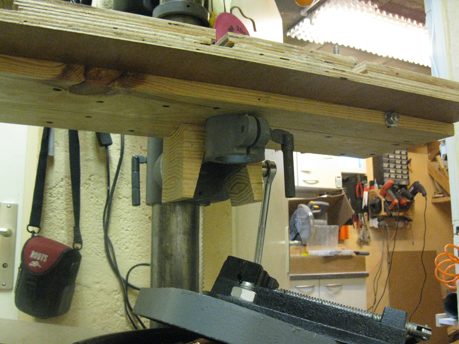 След няколко дневно ровичкане в нет-а стигнах до извода, че дървените масички се закрепват върху металните, но 3 сантиметра от капацитета на бормашината не ми се губеха и реших да го правя както аз си знам, а не както хората го правят и да закрепя масата върху съпорта за металната маса а не върху самата металната маса.
