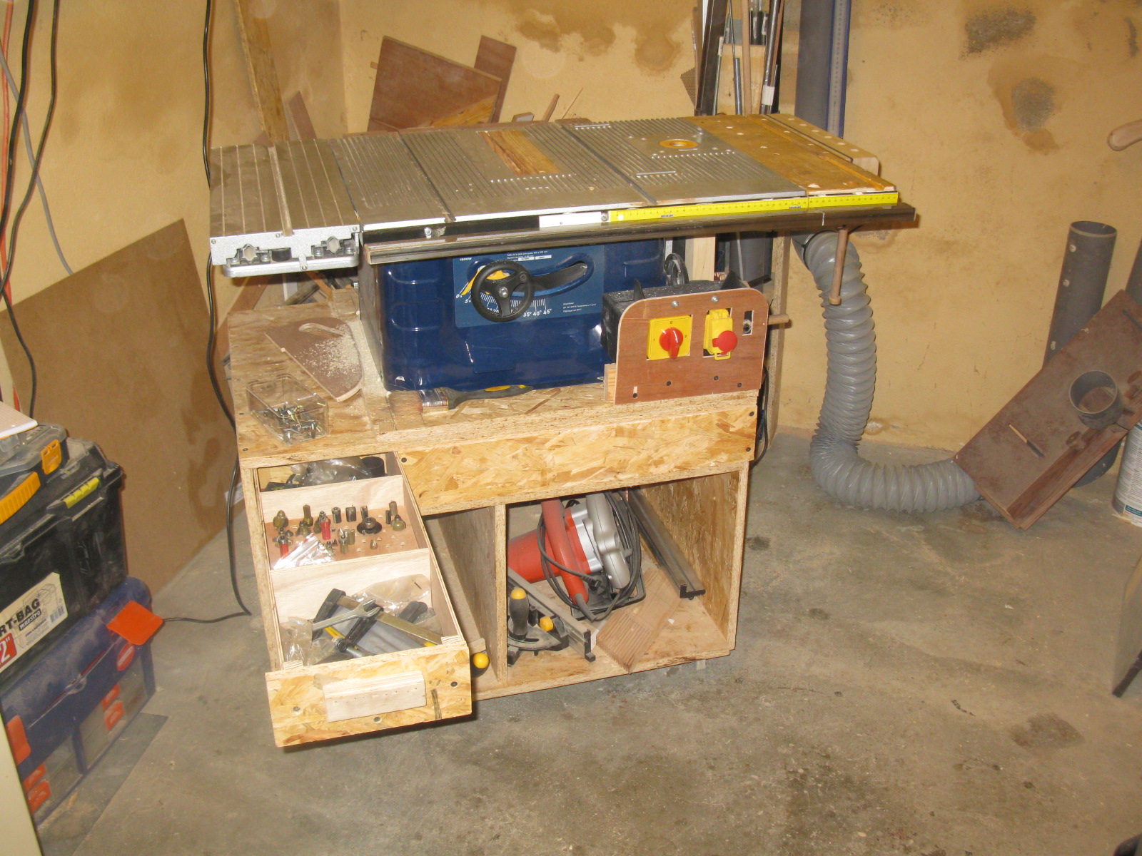 Масата в средата има дупка която се оказа че е много удобна когато използвам приставка за барабанна шкурка или когато имам опилки така, че прахоляка и опилките падат под масата където монтирах една кутия за целта. Дано от снимките нещо да е станало ясно но просто не съм снимал в процеса на работа.