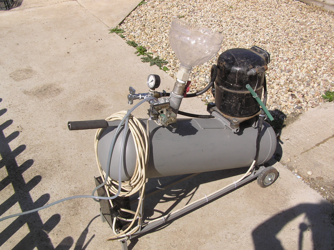 Ето какво сътворих тия дни, щото старата беше малка и се скапа. Газова бутилка, компресор от нещо (вече не помня от кво е) но е 1,1 кW монофазен, малко ВиК части и един ден работа. Пресостата е настроен 2,5-4,5 атмосфери, е не е фабричен нали трябва да е максимално направи сам.