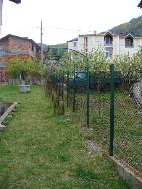 Това е моята асма, направил съм я от кух квадрат 50/50, а отгоре извитите тръби са шпригли от камион разрязани на половина. Отпред сложих челни дъски направени на винкел, а м/у коловете опънах поцинкована тел 2 мм. Сега предстои да направя водачи на всеки кол от квадрат 20/20 по който да опъна тел за да могат да се катерят малините и къпините който съм насадил м/у лозичките.