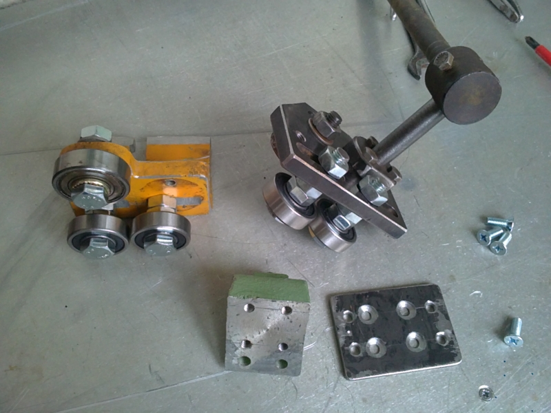 Здравей. На райдъра и на него е с едно лагерче на колелото, а остта е неподвижна и е захваната за механизма за накланяне на колелото. На този вала е подвижен в тялото(на снимката квадратното железо), а колелото е неподвижно(при мен е превъртяло) завито за вала. Цялото тяло с колелото се монтира на две оси в механизма за опъване и накланяне на колелото , ще снимам утре и него, забравих днес. Ако е само един лагер ще има страничен луфт, а така е на конзола. :partyman: