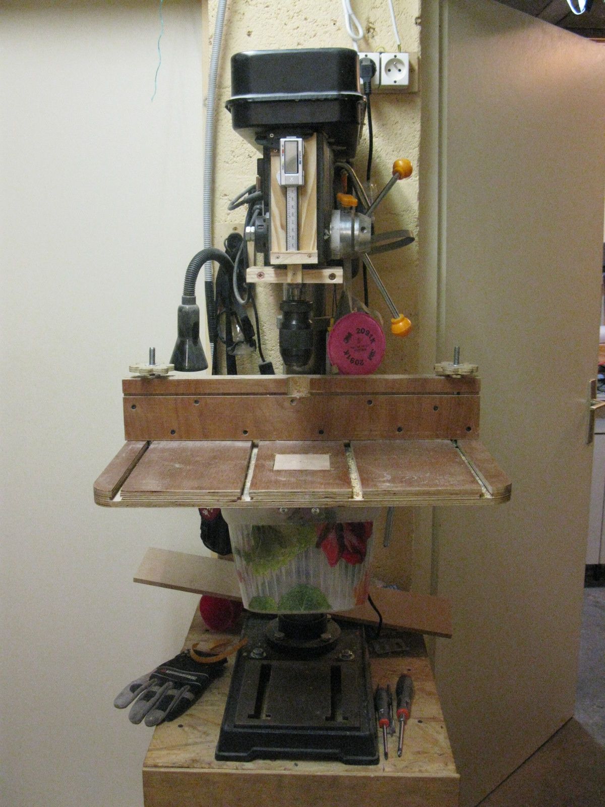 Масата е горе долу с стандартна конфигурация с 2 слота за водача отзад и 2 слота за закрепващи палци в средата. В средата има изрез който се сменя при продупчване. Масата е направена от 2 пласта шперплат 20 и 10 мм като горния слой е 10мм така, че лесно мога да си направя квадратни изрези за центъра като надупча тия които имам. В по дебелото парче шперплат бях направил изрези за болтовете и след залепване на горния слой в него направих допълнителни изрези така, че да се получат така наречените т-слотове. Честно да си призная домързя ме да си хабя фрезата за тази операция. На задния водач има слот който е направен по същия начин само че гърба е от ОСБ а лицевата част от шперплат. Закрепването на цялата маса става на гърба има един издатък който е с формата на два рога и точно копира формата на стъблото на съпорта на масата така че там масата ляга плътно, а за да не се движи самата маса има изрязан отвор който обхваща съпорта на металната маса и с един винт се стяга просто.