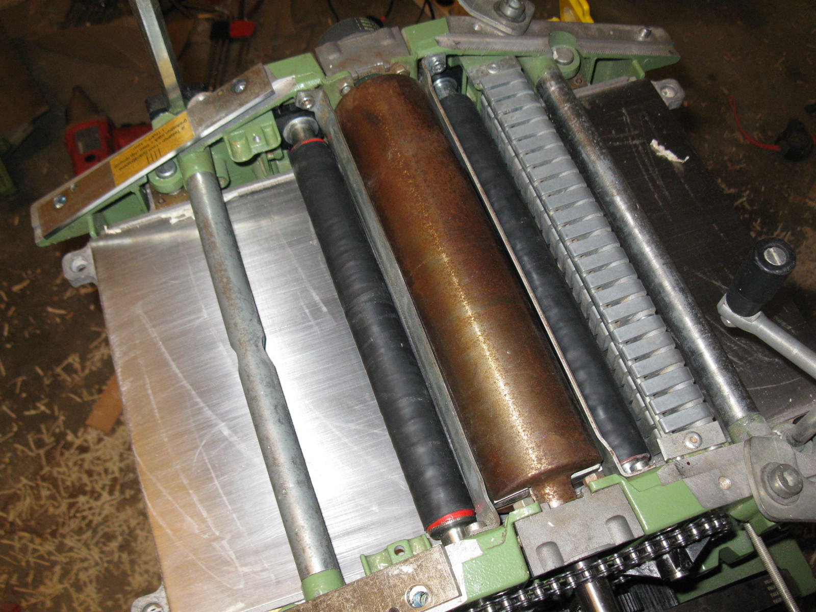 След като успях да имплантирам шублер на колонната ми бормашина реших, че ме мързи да зверя всеки път каква е настройката на щрайхмуса и реши да имплантирам същия тип шублер пласмасовата версия е доста по добра от целта от металната и с малко настройки успях да докарам грешката до 0.2мм което е доста малко :-). Трупчето към плота на абрихта е залепено с двойнозалепващо тиксо залепен е и шублера в изреза на масата за щрайхмуса. В главата на шублера направих каналче така че да мога да си донастройвам ако има грешка въпреки че шублера има нулиране. Шублера го настроих така, че да показва реалната стойност(машината не може да зема детайли с дебелина под 5мм) така няма да се чудя колко би трябвало да е детайла в момента.