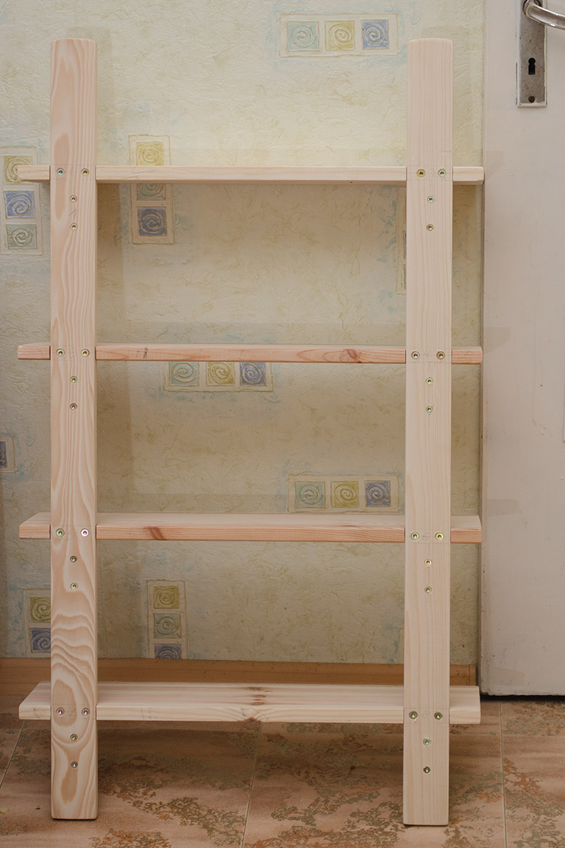 Не разполагам с кой знае какви машини - дрелка и прободен трион с който трудно се реже права линия. Обаче повечето прави разрези ще са вече готови. Вариант е да поръчам летви и рафтовете да не са от шперплат. Тях също могат да ми ги нарежат в магазина.
