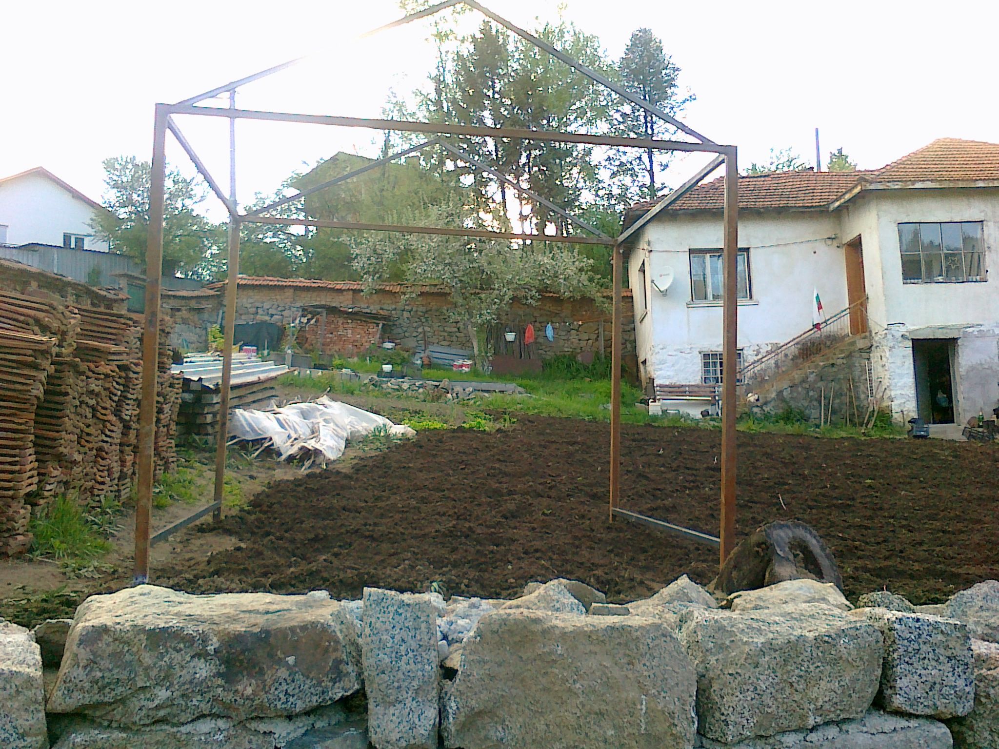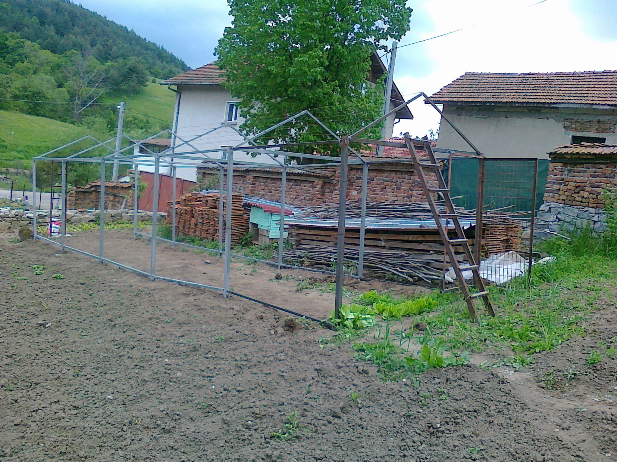 Здравейте като материал съм използвал квадратен и правоъгълен профил(50х50;50х30;30х30;20х30 тел черна 2,5мм дебела болтове М12х80дълги)това е за конструкцията цена около 350лв. Найлон,мрежа за засенчване на 30% и лента за укрепване ги взех от една фирма от Русе ''Анни-пласт''цена 220лв. с доставката http://anniplast.com/ и другото е работа с електрожена.Много излишна заигравка да сложа и желязно било а и аз искам парника да ми е разглобяем ако забелязвате направил съм го на секции за да мога да го места защото това не му е правилното място.Найлона добре е легнал и добре се е опънал отгоре няма опасност от кореми гарантирам имам голям наклон няма как да се задържи толкова вода че да се огъне найлона