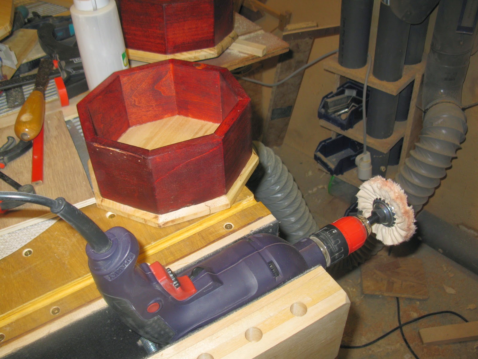 Използвах случая да се пробвам с байцване защото ми се стори, че на тъмно кафяво дърво ще тича месинг(оф цвят). Взех 3 от тези и байц "череша" и "тик" пак от там (на лакпром). В процеса разбрах 3 неща за байцването (поне):