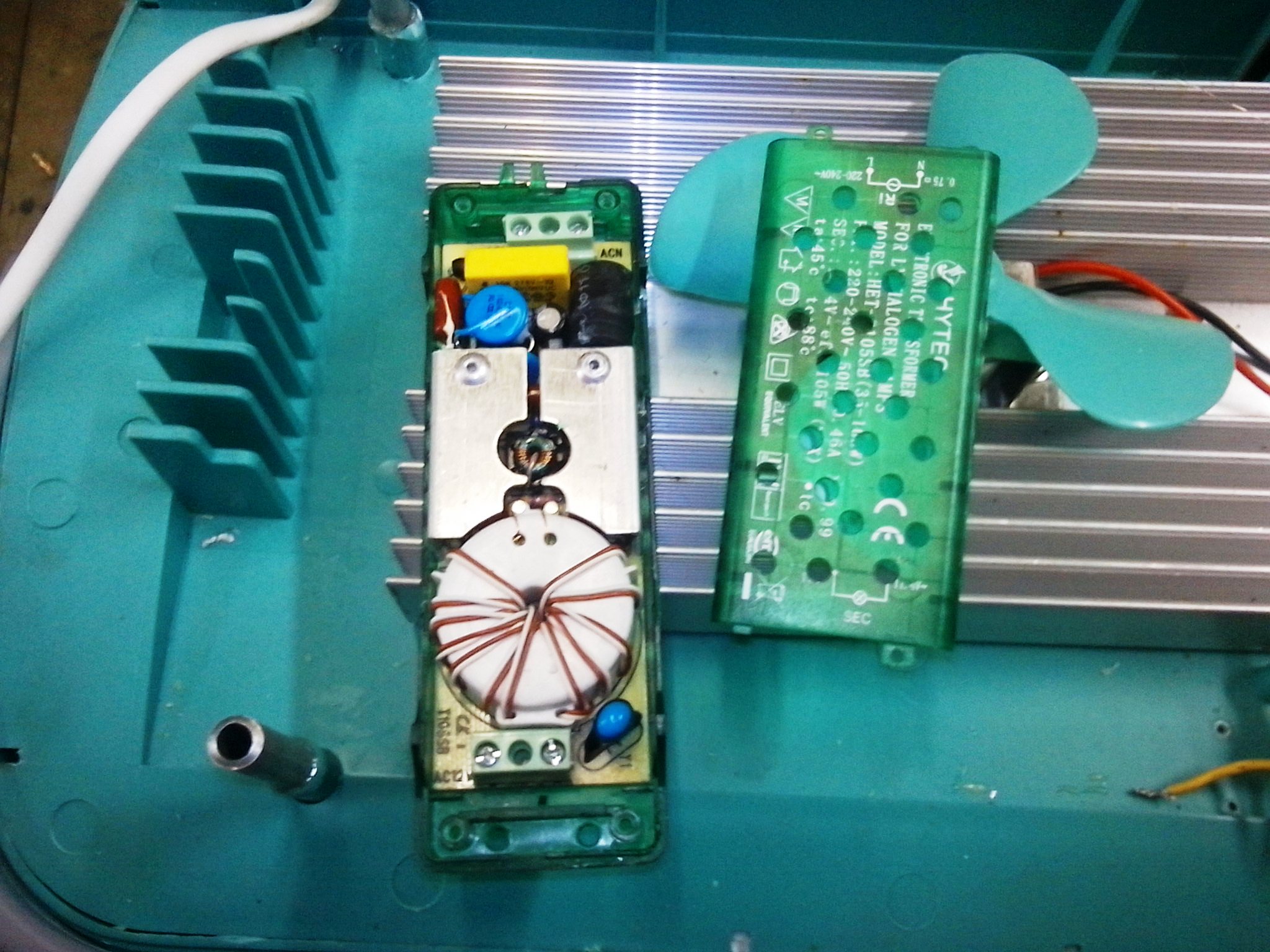 Та първо резнах 4 тръбички за дистанционни втулки и направих захващането на обратно от горе и след това започнах по съществената доработка. Сложих едно импулсно трафче 105W на което пренавих вторичната намотка като добавих още 3 витки защото напрежението му е малко и не му достига. Оказа се хептен китайско менте ама и то стана след доработката но му и поразпробих кутията щото ми се струва, че ще грее като се натовари а така или иначе има какво да го обдухва там. За изправянето един грец с едни дърти руски шотки диоди и някакво парче от радиатор което нарязах. Домързя ме да се качвам до тавана да търся нещо по компактно пък и кой ще гледа какво има вътре. Съответно парче кабел със щепсел и няколко скоби за тръби щото да има къде да се събират и закачат когато не се ползват. И последната екстра за гъдел му добави едно термометърче за 2 лева. Ампулата му е защипана между ребрата на вътрешния радиатор и меренето не е много точно но все пак дава някаква приблизителна ориентация какво става вътре.
