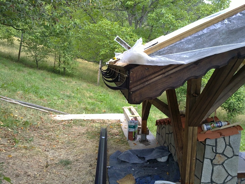 След него боядисах колоните и челните дъски със грунд от Лидл(хареса ми цената, а и преди съм боядисвал с Бауфикс лак на водна основа, доволен съм) за да мога да поставя улуците- Завинтвам крайните скоби, едната е на около 2-3 см по ниско от челната дъска(по посока на стичането на водата) опъвам канапа и донареждам другите скоби и водостока за тръбата. Другото беше лесно, режеш по размер улука, тапи и го щтракаш в скобите.