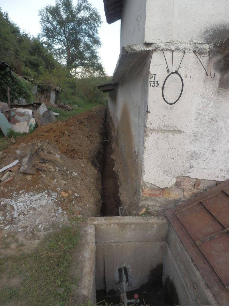 Вчера го докарах до събирателната шахта, оттам вече е лесно - само тръба за отвеждане. Счупихме се от бързане двама човека 5 дни, да изпреварим дъжда. Сега го заравям на това положение, че прогнозата е кофти, да не ми напълни трапа с вода, че е до основите, а те вече веднъж са поддавали през годините и стената се е пропукала около ъгъла на постройката