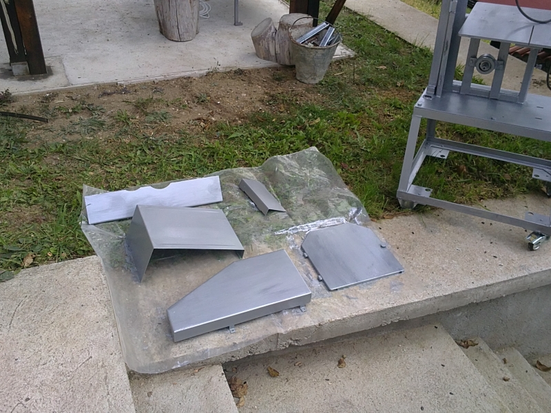 Вече сглобен. Монтирах и успоредния водач от габровски абрихт. Наложи се да преместя единия му водач, за да мога да го местя максимално наляво спрямо лентата, иначе опираше в тялото на банцига. И накрая изпробвах с новия двигател(щях да правя лентов шлайф с него, вече няма :lol: ) върху черешови клонки.