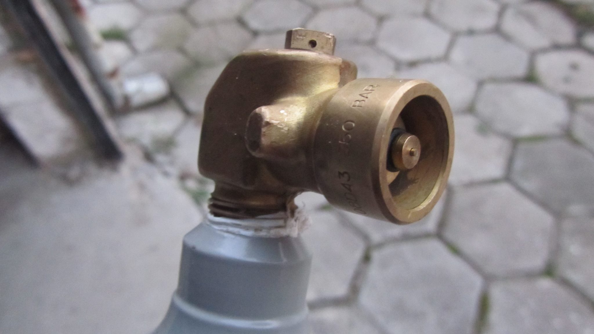 Малко се прее'ах с една бутилчица, но ми се ще да я накарам да заработи. Взех я с идеята за дребни заварки да не размъквам голямата бутилка. Но досега не открих никой да ми каже от какво е тоя клапан, за да търся насрещника му, или поне как работи за да начертая насрещник и да го дам на стругар. Вижда се, че пише CocaCola на него и допускам, че е от някакъв постмикс. Питах един дистрибутор на безалкохолни, но не беше виждал такова. Питах в Месер (зареждат газове), но и те не бяха виждали такъв, и нямаха друг подходящ да сменят тоя. Та някой ако е в час с това - ще съм благодарен.