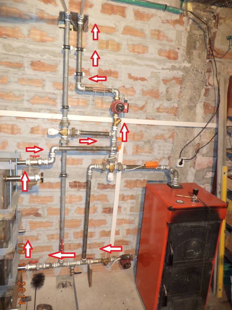 На снимката малък кръг е показан трипътен вентил на малкия кръг, който до нагласената температура пропуска в права посока , а над тази температура пропуска нагоре към радиаторите и буфера. Сондата е на входа на котела. Защитава котела от влизане на студена вода.