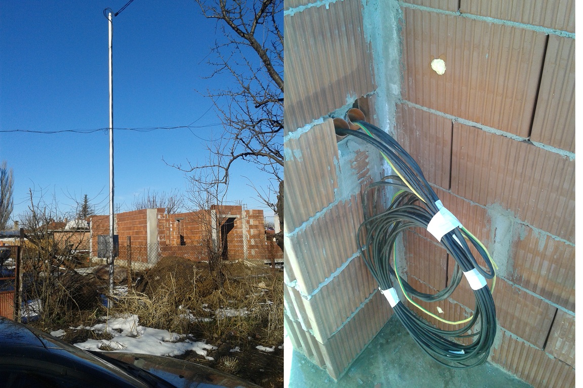:) това е меко казано несериозно, да не казвам опасно. тонито, ако не си го изправил още, първо го почисти от ръжда и др. После грунд и боя за метал. Не забравяй да завариш няколко големи гайки горе(ток, тел, нет, тв и т.н.). Ако мислиш да прекараш кабелите въздушно сложи гайки от двете страни, към пътя и към твоята къща, ако ще са под земята в твоя двор само към пътя. Копаеш ПОНЕ 120см дълбоко и бетонираш ... че като дойдат от енерго-то или от кабеларката ще изправят една стълба и ... а не ми се мисли 60см и бурен вятър! Внимавай гайките да са поне на 5м от земята при изправено положение. Ето как е при мен стълбът и подземни кабели които минават през основите в ПВЦ. Ниско-токовите са в отделна: