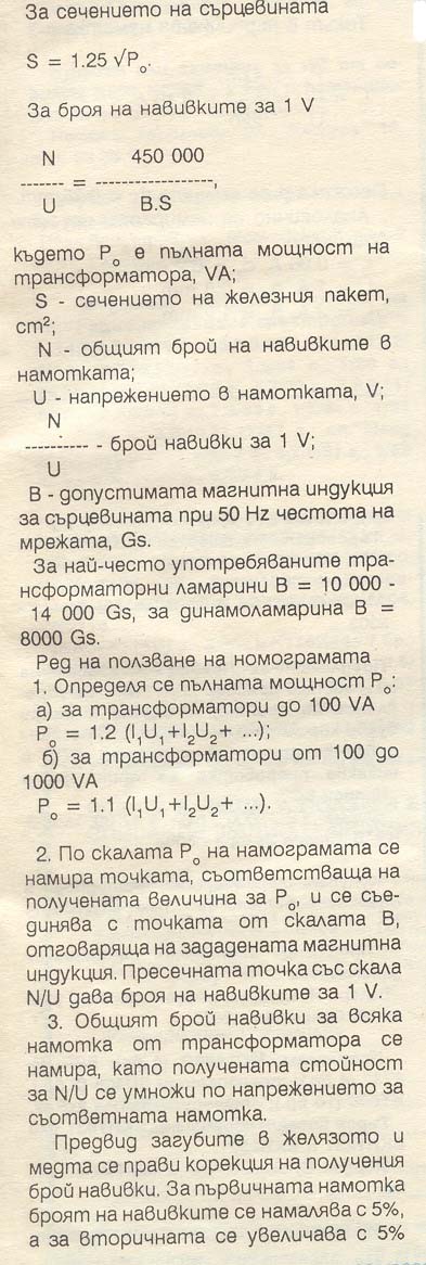 W/V=45/(B*S), където B е работната индукция (около 1-1,2Т); S e сечението на магнитопровода, а W/V са навивките за 1 волт. От тук, като се умножи W/V по 230V, се получават навивките на първичната намотка и т.н. и т.н.