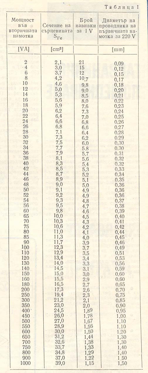 W/V=45/(B*S), където B е работната индукция (около 1-1,2Т); S e сечението на магнитопровода, а W/V са навивките за 1 волт. От тук, като се умножи W/V по 230V, се получават навивките на първичната намотка и т.н. и т.н.