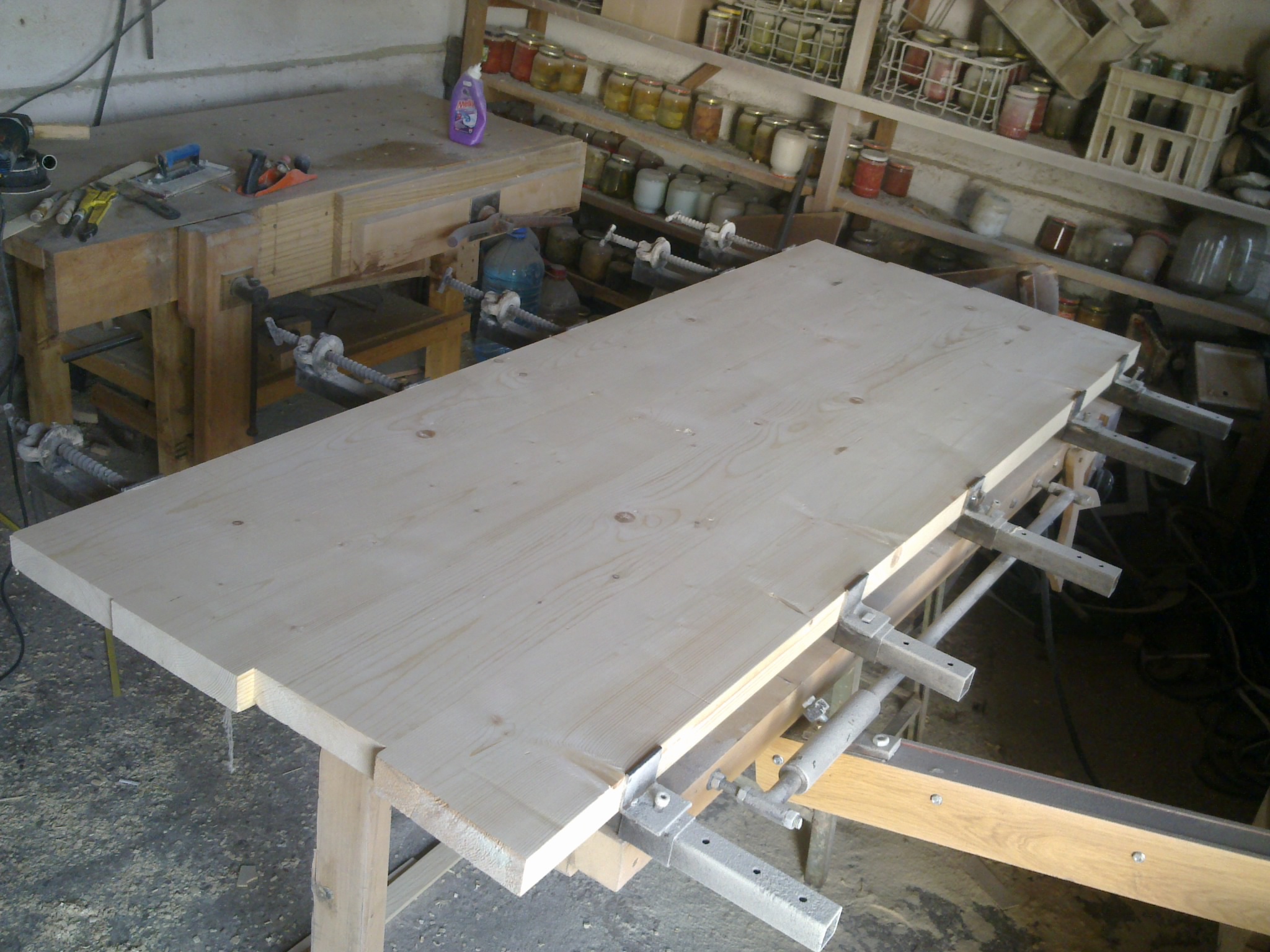 Както Ванката каза, обикновено тук проблемът се решава, като отдолу се монтира напречен елемент и отделните дъски, съставляващи плота, се завинтват за него през РАЗШИРЕНИ ДУПКИ, за да може плотът да се свива и разширява свободно.