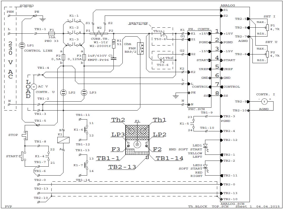 Има токоограничение (обратна връзка по ток) и обратна връзка по напрежение (DC, когато се ползва за управляем изправител). В случая джъмперът е прекъснат и има само управление по фазов ъгъл и токоограничение.