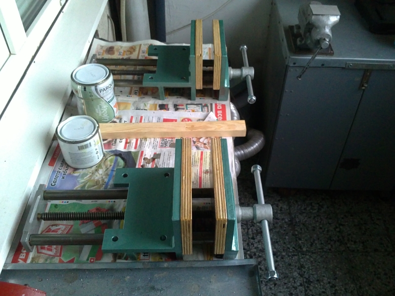 Припаснах челните плочки от кофражен шперплат за да прилепват плътно, без луфт. С дисковия шлайф и едно малко ренденце се получиха нещата. И ги захванах с винтове на място. Последно боядисах кантовете на кофражния шперплат за да не дърпат влага с двукомпонентен полиуретанов лак за паркет. Без челата се отварят на 23 см челюстите, с челата отваря до 19,5см. Кажи речи 9 инча стана, това може да се увеличи с преместване на задната опора напред към винта.