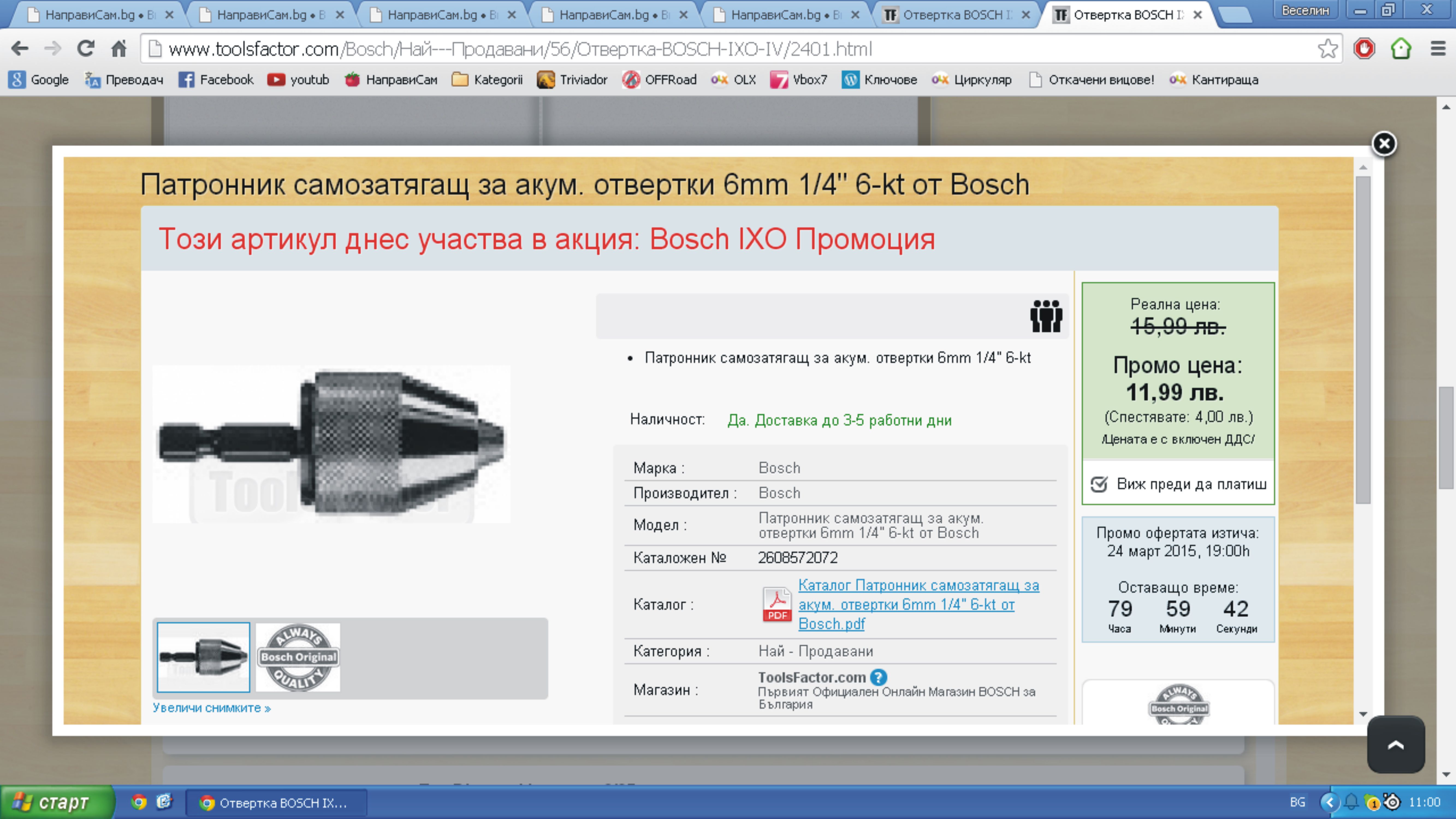 DeyanS написа:Колеги, малко в страни от темата да ви попитам. Купих си електрическата отверка Parkside A1 3,6 V. Въпросът ми е, дали продават някакви допълнителни приставки, които да могат да се слагат на машинката, а вече към самата приставка да може да се слага бургия. Идеята е да могат да ползвам машинката за някои дребни дупки в тесни пространства, където не може да влезе бормашината.Нещо такова търсиш - http://www.toolsfactor.com/Bosch/%D0%9D ... D0%BA/1085 Много зор видях преди години да си намирам свредла с шестостен, та това спаси положението.