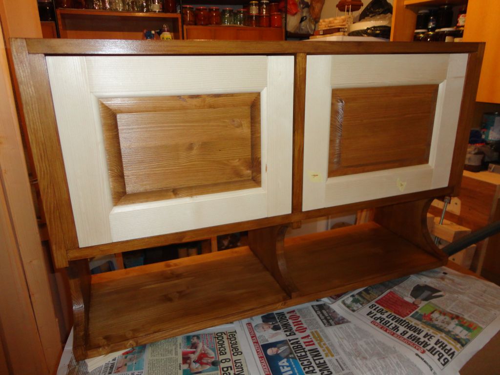 Тези дни съм в отпуск и поработих малко.Направих втория долап от серията ВИЛА.Ще е над долапа в дъбовия плот, закачен ще е за стената.Нищо особено - стандартна кройка, малко разчупен долен открит рафт.Вратичките са по стандарта на серия ВИЛА - вътрешни с външни панти.Изработени са на оберката.Пантите съм ги разглобил, виждат се на снимката да им сменя осите, че фабричните луфтове не ме устройват.Материала е чам.Долапа е с плотове 22 мм, рамката на вратата е 19 мм.Лака е ДУФА цват ДЪБ.Бялото на вратите и таблите ще се минат с две-три ръце цвят ТИК.