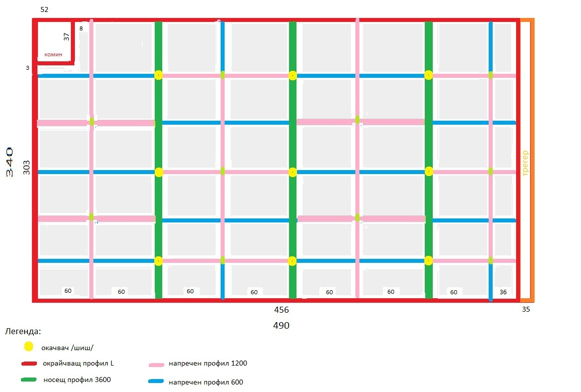 Извинявам се ако има тема за тези тавани, но не намерих. Искам да попитам дали, както съм направил скицата на тавана ще изглежда добре и дали може нещо друго да се направи? До комина има 3 см. разстояние което предполагам с окрайчващият профил ще го обера. Смятате ли че тези 9 окачвача са достатъчно, четох из форумите и там дават по 8 кг на м2. Може и 12 да сложа не е проблем, както се казва един път се прави.