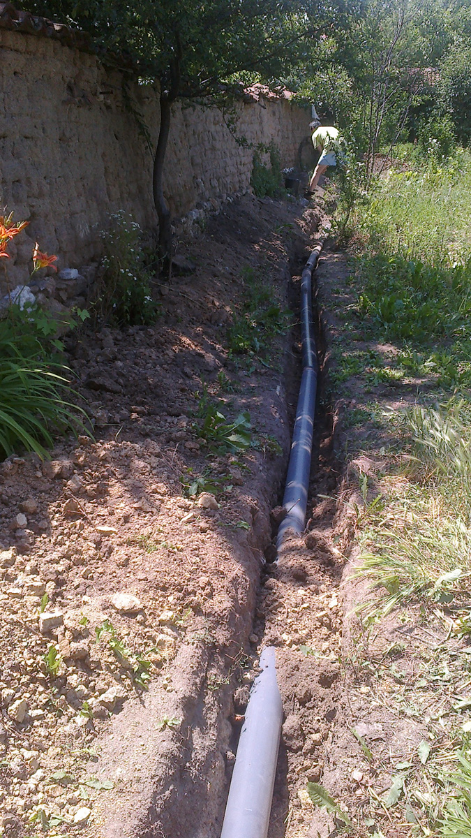 До колкото ми е известно тръбата ф110 трябва да лежи на пясъчна възглавница и да е покрита с пясък, а след тона пръста с камъните. Така се предпазва от счупване при натиск отгоре. Надявам се си спазил нормата за наклона. Колкото за лозите, двора си е твой, но изкореняването на лози е грях :wink: така казват стари хора.