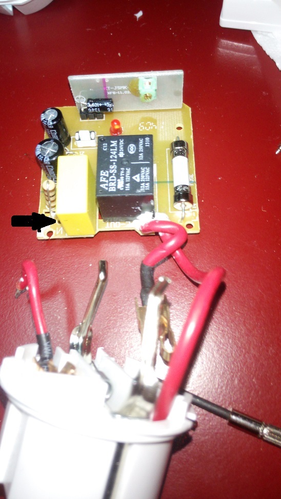 Този има защитни прорези на платката и вътрешен предпазител, който според упътването се сменя от производителя, ако гръмне. :-D Този обаче има едно странно решено "свързване" на нулевия кабел към платката( на първите две снимки има стрелка, която сочи към отвор в спойката, който е пробит с бургийка :shock: и в нея е мушнат свободно кабела като само е фиксиран с топъл силикон отгоре на платката за да не се измъква.