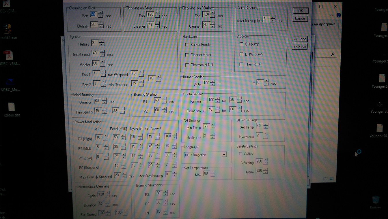 Ами браво, това е поне трети споделен във форума проект! От снимките не става ясно как си монтирал платката - под капака или в оригиналната отделна кутийка? Колкото до настройките - времената на зареждане и на работен цикъл при максимална мощност можеш да ги вземеш от старото управление, но за вентилатора ще трябва да си поиграеш. За ориентир може да ползваш опита на другите колеги, но трябва да ги провериш и евентуално промениш, пък после да споделиш и твоя опит :) . Успех.
