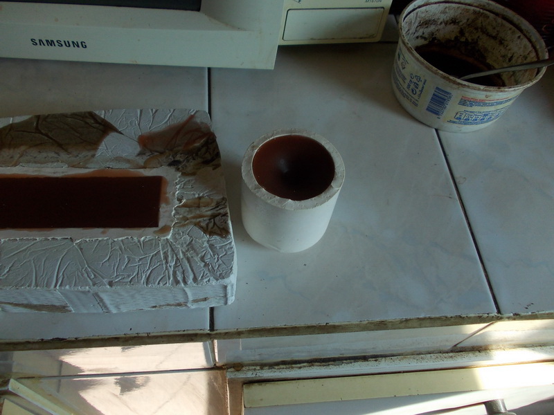 Обикновен строителен гипс смесен с гипсова мазилка на KNAUF в съотношение 1:1. В гипсовата мазилка има ситен кварцов пясък и забавител на застиването - удължава времето за работа със сместа. Може да се добави и до 20 % стрит перлит като пълнител и термоизолатор. Сместа се прави относително редичка (гъста боза) за да може да се налива върху модела. Ако ви се стори все пак бързо застиването на сместа може да добавите 2 - 3 капки на литър смес ръждопреобразувател (разредена ортофосфорна киселина). Покрива се с налон за да се изпарява бавно водата поне за 4 - 5 часа. След това се отваря и се оставя минимум за 10 часа да съхне при нормална стайна температура. При заливането на модела - най-напред се прави тънък слой от порядъка на 3 - 6 мм. Преди да е застинал напълно гипса се слагат парчета ситна метална мрежичка (комарна или малко по-едра) като арматура, която не позволява напукването на формата при следващите обработки и отливането, след което се залива със слой гипс с дебелина минимум 4 - 5 см.