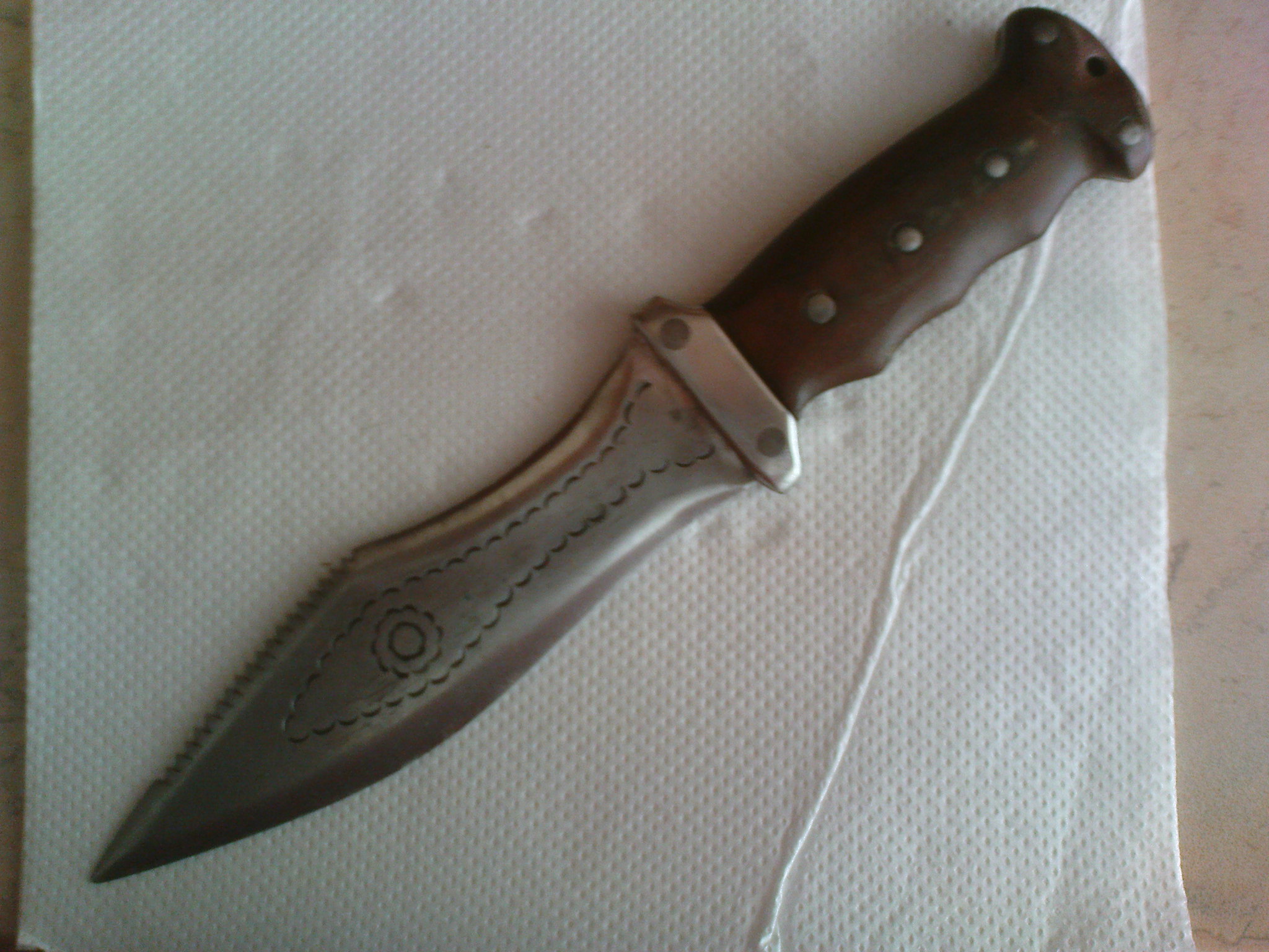 Ето и снимките на ножа. Дръжката е от текстолит. Не знам това назъбване на гърба на острието за какво е, не съм го пробвал дали реже като трион. Самия нож явно не е заточван, имам го много отдавна от един приятел.