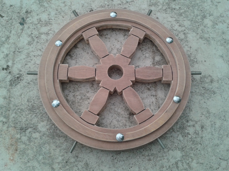 А ето как две кръгли парчета шперплат, от една макара се превърнаха в корабен щурвал. Ще го сложа тия дни на пързалката, за да се превръща във въображаем кораб....