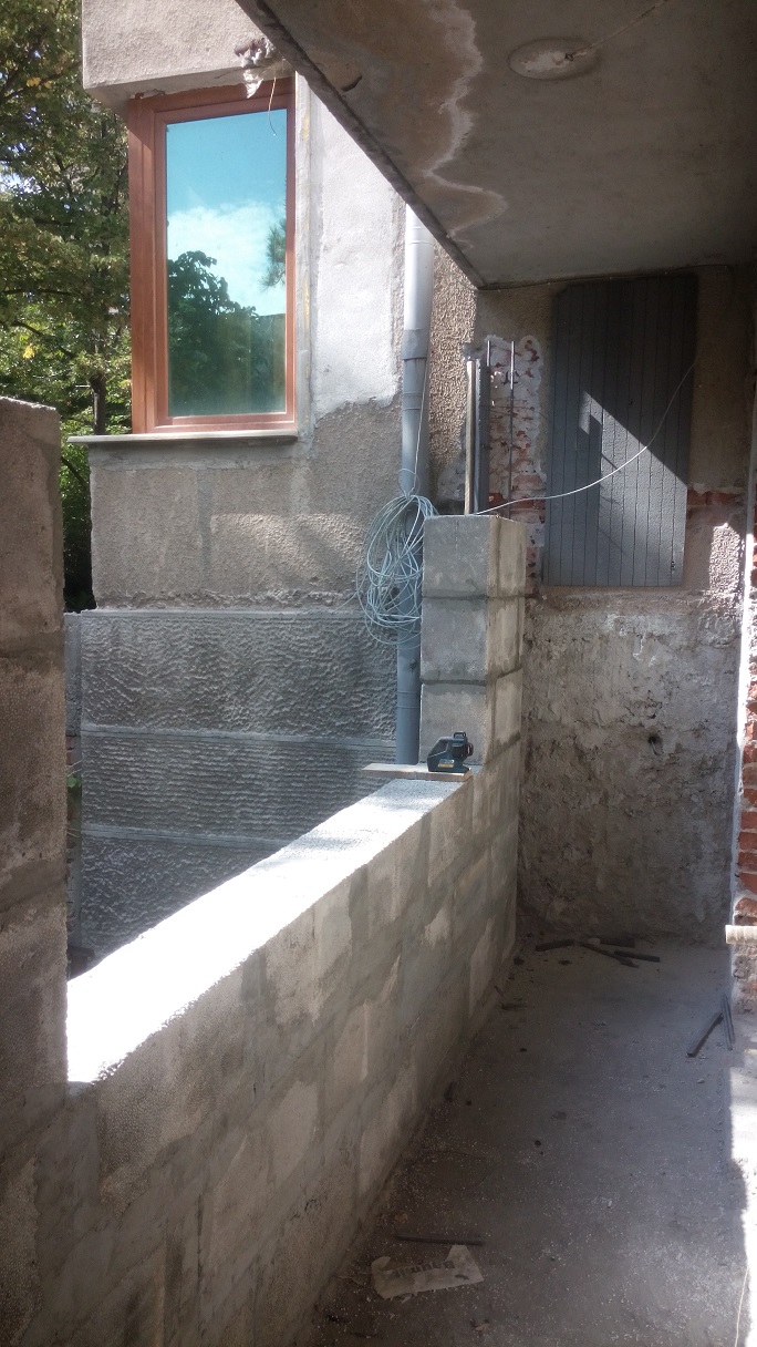 Тука ще има един проблем с големия отвор на прозореца и понеже бърза, няма време да кофражираме и да излеем щурц над прозореца. Иска да ползваме от готовите тухлени щурц-ове запълнени с мозайка на 3м. Утре ще се зорим да ги укрепим с винкели понеже иначе провисват от тежеста си..