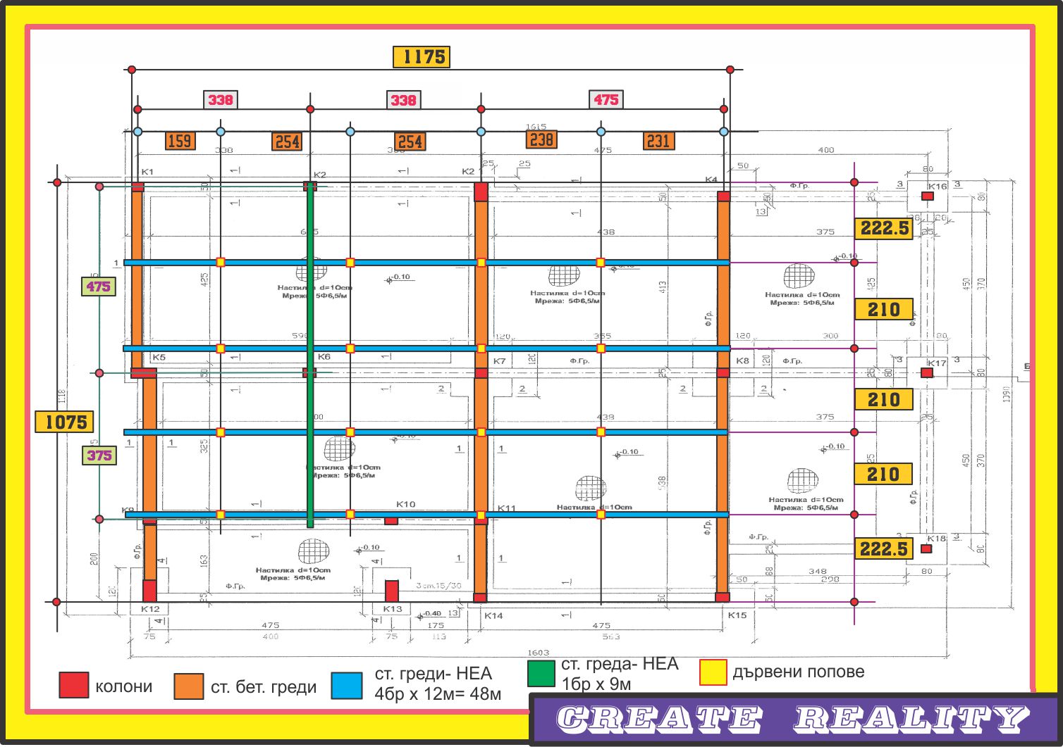 Нищо не се променя освен, че плочата отпада и се заменя със ст. греди, прибавя се по 1 поп на столица, сеч. на столиците се намалява, там където ст. греди стъпват върху ст. бет. ще се наложи допълнително армиране. ========= Отворите на ст. греди са максимум 475см., което е доста икономично, а тeзи на столиците 210см. ============ Остава да се изчислят HEA гредите и да се преизчисли (намали) сеч. на столиците. ============= Обзалагам се , че предложения вариант ще излезе по-евтино от изливане на плоча.(ст. бет. греди и в двата случая се изливат).