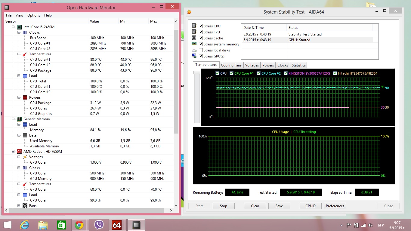 Лаптопа е без подложка и принудително охлаждане. Чистен е (и смяна на паста) преди 3-4 месеца.