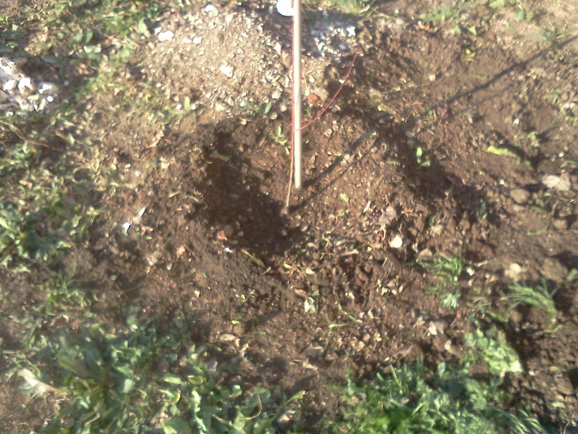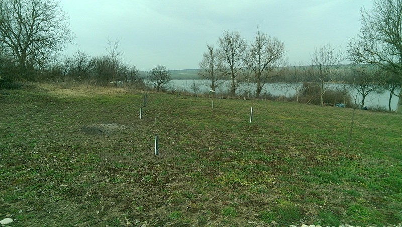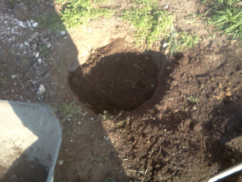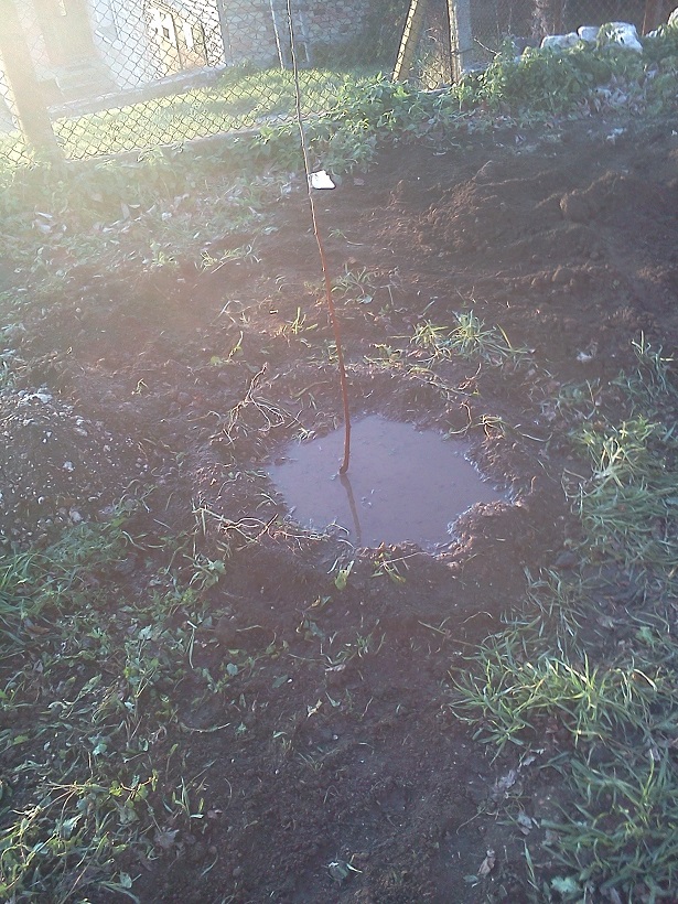 Запълване на 2/3 от дупката със смес от торф и почва и 2 лопати прегоряла тор. Подрязване 2-3см на най-дългите корени успоредно на земната повърхност (сухи и счупени нямаше). Потапяне в кофа с глинена каша. Засипване на корена с чиста пръст, дозапълване на дупката със сместа от торф и почва. Утъпкване отвън-навътре. Окото на калема на юг на 2-3 см над повърхонстта. Оформяне на чаша около дървото. Обилно поливане и поръсване с оборска тор, пак около 2 лопати на дупка.