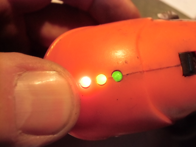 Но имам един такъв въпрос - ако някой има такава отвертка , да напише какви диоди и кога светят, на тази при включване на жака за зареждане светва червена и така ,докато не я изключа, а другите -зелен и жълт светят само когато натисна бутончето до тях . Не трябва ли ,когато е заредена батерията да светне зелена светлина ? На снимките цвета на червения светодиод не е реалния ,вижда се като бял, но това е вероятно от снимката .
