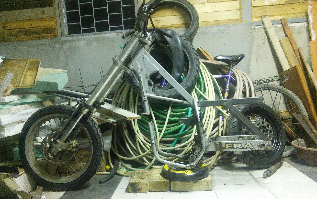 Сега сглобено в груб вид изглежда така: За основа съм ползвал ендуро мотор Gilera GSM 50. От него взех само рамката предната вилка, колелетата, седалката и стойката дето държи седалката, ид неща които ще се виждат от снимката. Задното колело го направих от резервана гума тип патерица: ,