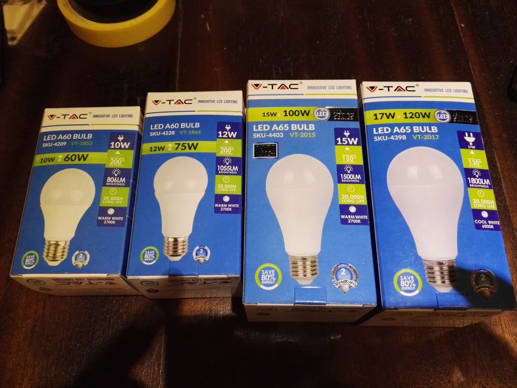Наложи ми се да купя няколко LED крушки от Практикер и се оказа че на V-Tac има най голям избор и от мощности и от цени.Тогава ми хрумна идеята да направя една любителска база данни и сравнения на крушките които имам налични.Лампите са 12 броя