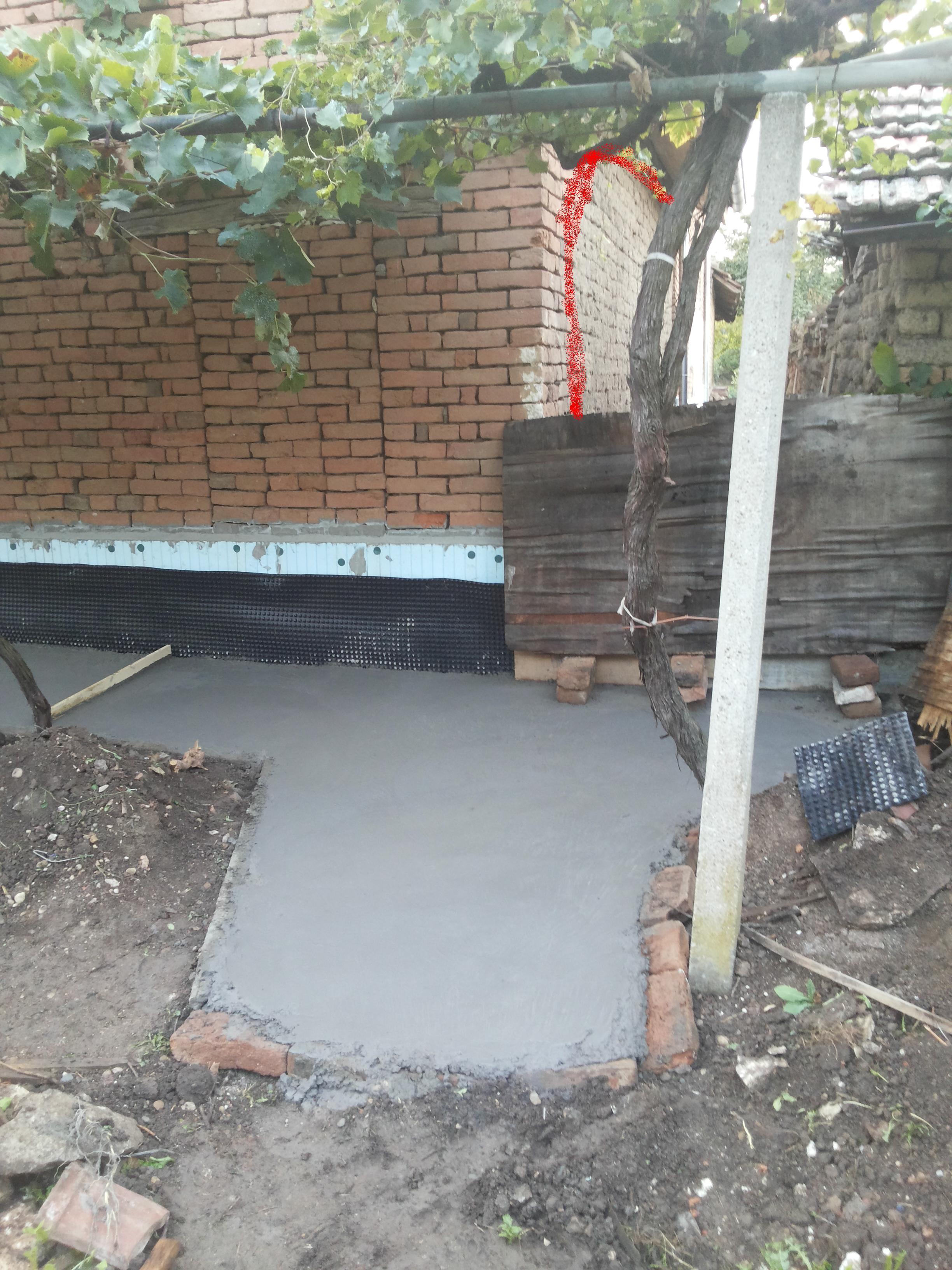 Намерих снимка от лятото, когато слагах изолация на основите. Стената с кирпича е от червеното до първия улук, който се вижда.