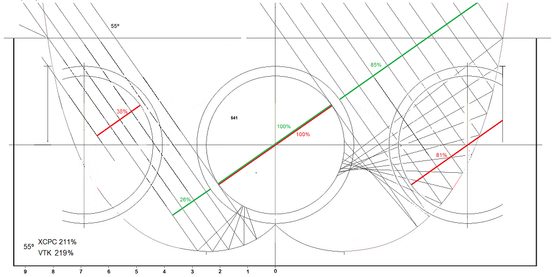При ъгъл 35° над хоризонта тръбите на VTK се засенчват една от друга на 28%, КПД за тази площ е 157%. При същия ъгъл има засенчване 18% на вакуумната тръба в XCPC от рефлектора, но в осветената му част има много добър ъгъл на пречупване и идеален ъгъл на усвояване от вътрешната абсорбираща част на тръбата, което носи допълнителни 92%, плюс 82% от пряко осветената част, общо 174% КПД.