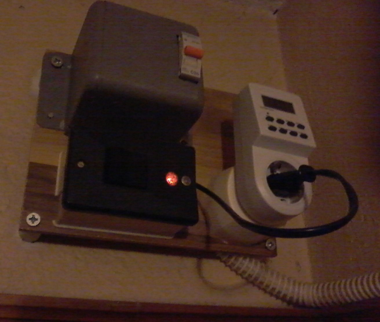 От 5 години ползвам този таймер, досега съм нямал проблеми с батерията. В металната кутия е контактора и предпазител 20А, ключът под него шунтира контактора за да може да се включва бойлера без да се активира контактора. На таймера пише максимален товар 3500 вата.