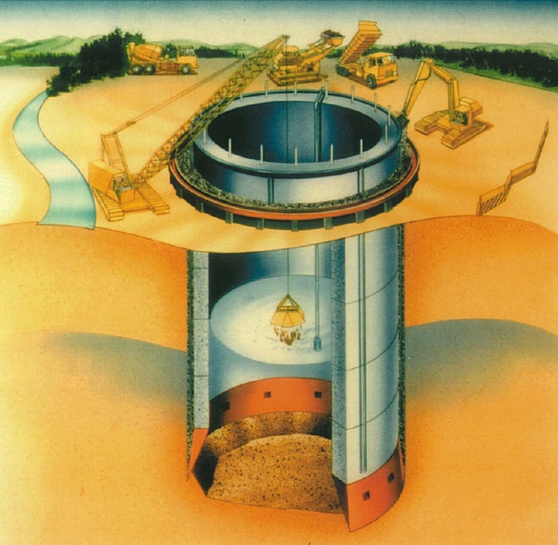 1.4.Сондажни(изливни) пилоти (Piled Walls, Bored Piles). Прави се сондаж с определени диаметър и дълбочина. И както при шлицовите стени, има отново спускане на армировката и бетониране с постепенно изваждане на обсадната тръба. Приложението им е доста сходно с това на шлицовите стени, плюс ползването им за основи на пътни мостове и др. подобни съоръжения, при които прилагането им е по-евтино от традиционното плоско фундиране.